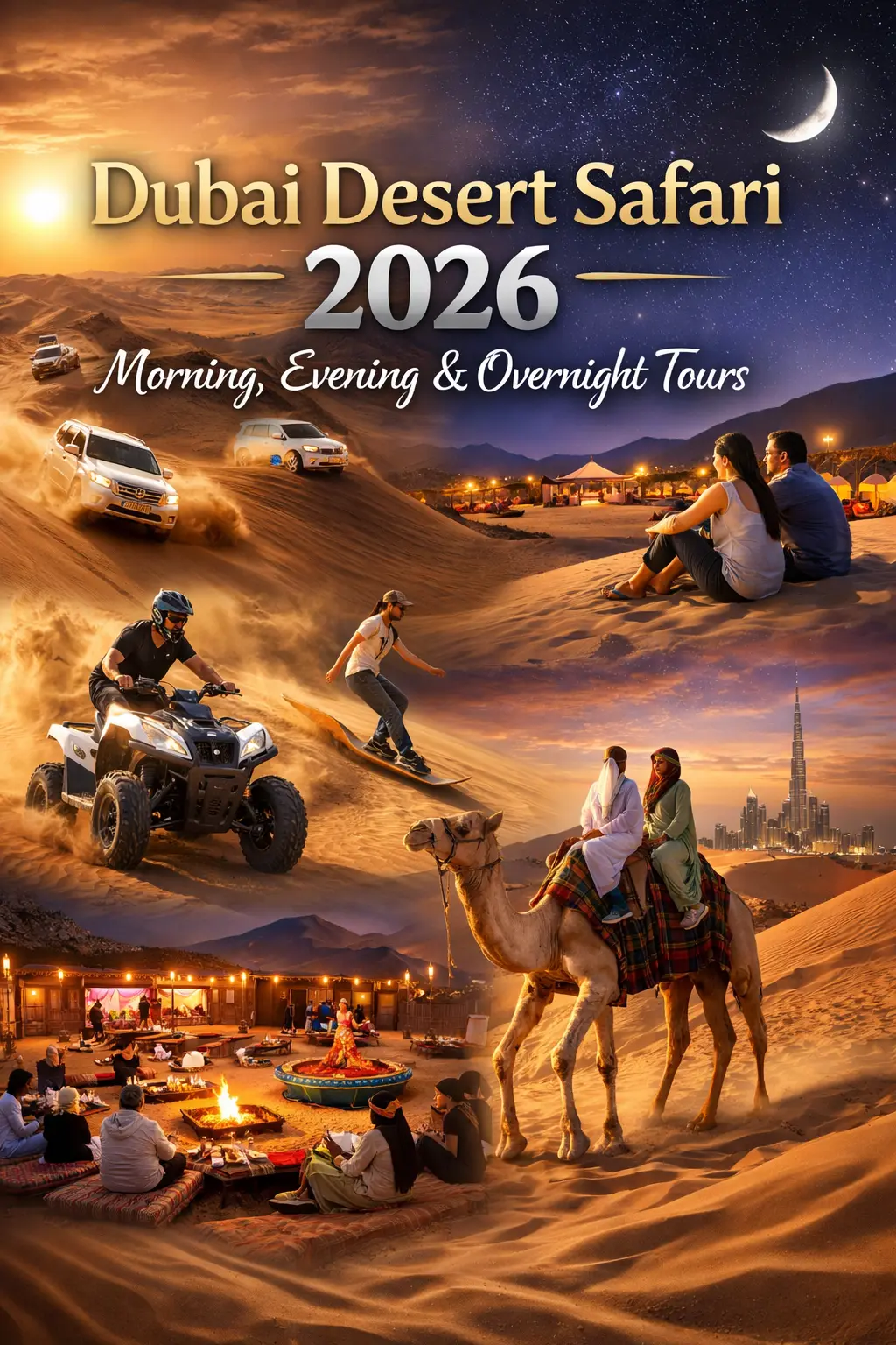 With various safari options, including morning, evening, and overnight desert safaris in Dubai, you will get to capture a glimpse of the cultural heritage and beauty, and enjoy an unforgettable experience. The Dubai Desert Safari 2026 invites you to delve into the heart of the Arabian Desert and explore the golden sands of Dubai, offering a one-of-a-kind desert safari experience. So, get ready for a thrilling, once-in-a-lifetime experience on the Dubai Desert Safari tour.